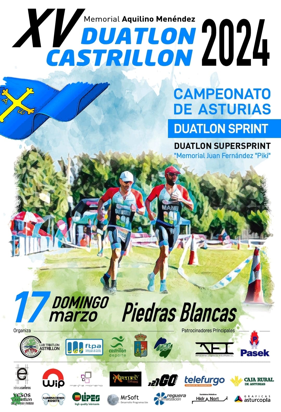 El Club Castrillón Triatlón, junto a la Federación de Triatlón del Principado de Asturias, organiza el XV Duatlón Castrillón – Memorial Aquilino Menéndez. Cto de Asturias de Duatlón Sprint + prueba de promoción SuperSprint.