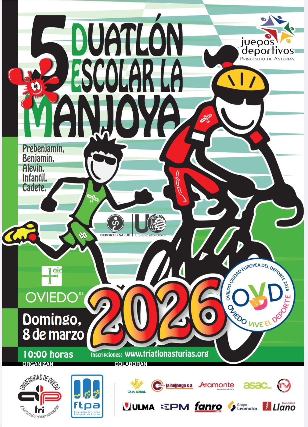 Duatlón Escolar La Manjoya + Añadir Google Calendar Exportación + iCal / Outlook 00 días 00 horas 00 minutos 00 segundos Fecha Mar 08 2026 Hora 10:00 - 13:00 Localización La Manjoya (Oviedo) Categorias Juegos Escolares 2026 Compartir este evento