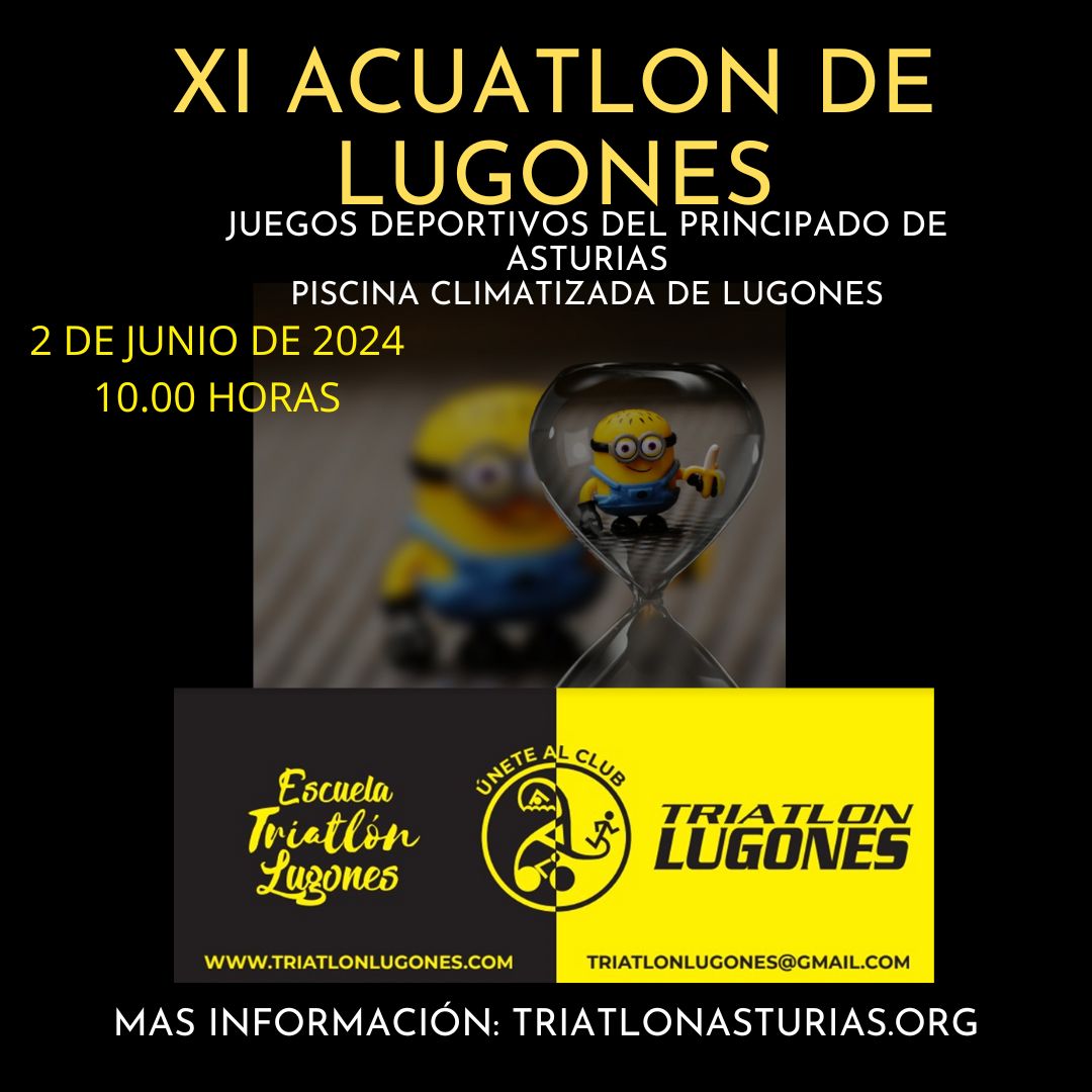 El Club Triatlón Lugones, junto a la Federación de Triatlón del Principado de Asturias organiza el XI Acuatlón de Lugones, el próximo 2 de Junio, dentro del marco de los Juegos Escolares del Principado de Asturias 2023/2024