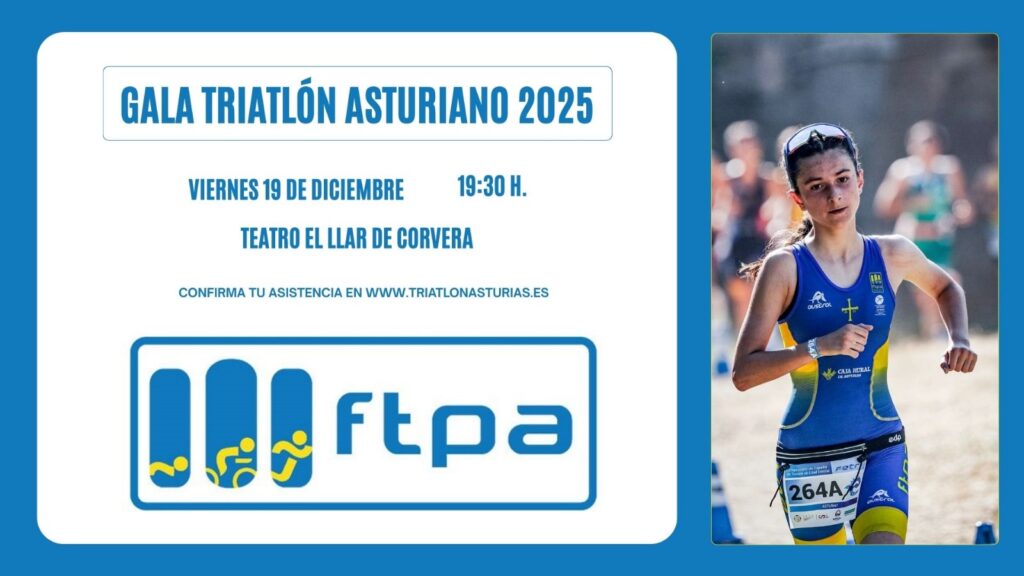 La Gala del Triatlón Asturiano 2025 se celebrará el próximo viernes 19 de diciembre a las 19:30 h en el Teatro El Llar de Corvera, y en el transcurso de la misma se entregarán diferentes galardones correspondientes a la temporada que concluye. Las y los galardonados deberán confirmar su asistencia a través del correo federacion@triatlonasturias.org, y acompañantes y público en general podrán hacerlo a través del formulario accesible en www.triatlonasturias.es.
